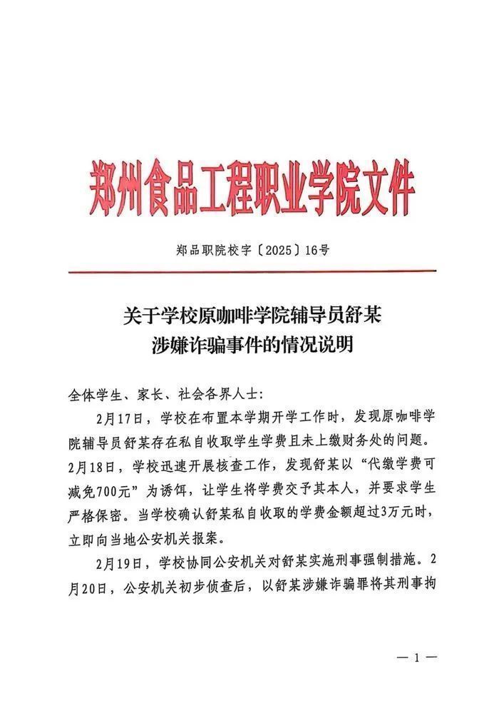 2月26日凌晨,“郑州食品工程职业学院”微信公众号发布《关于原咖啡学院辅导员舒某涉嫌诈骗事件的情况说明》。